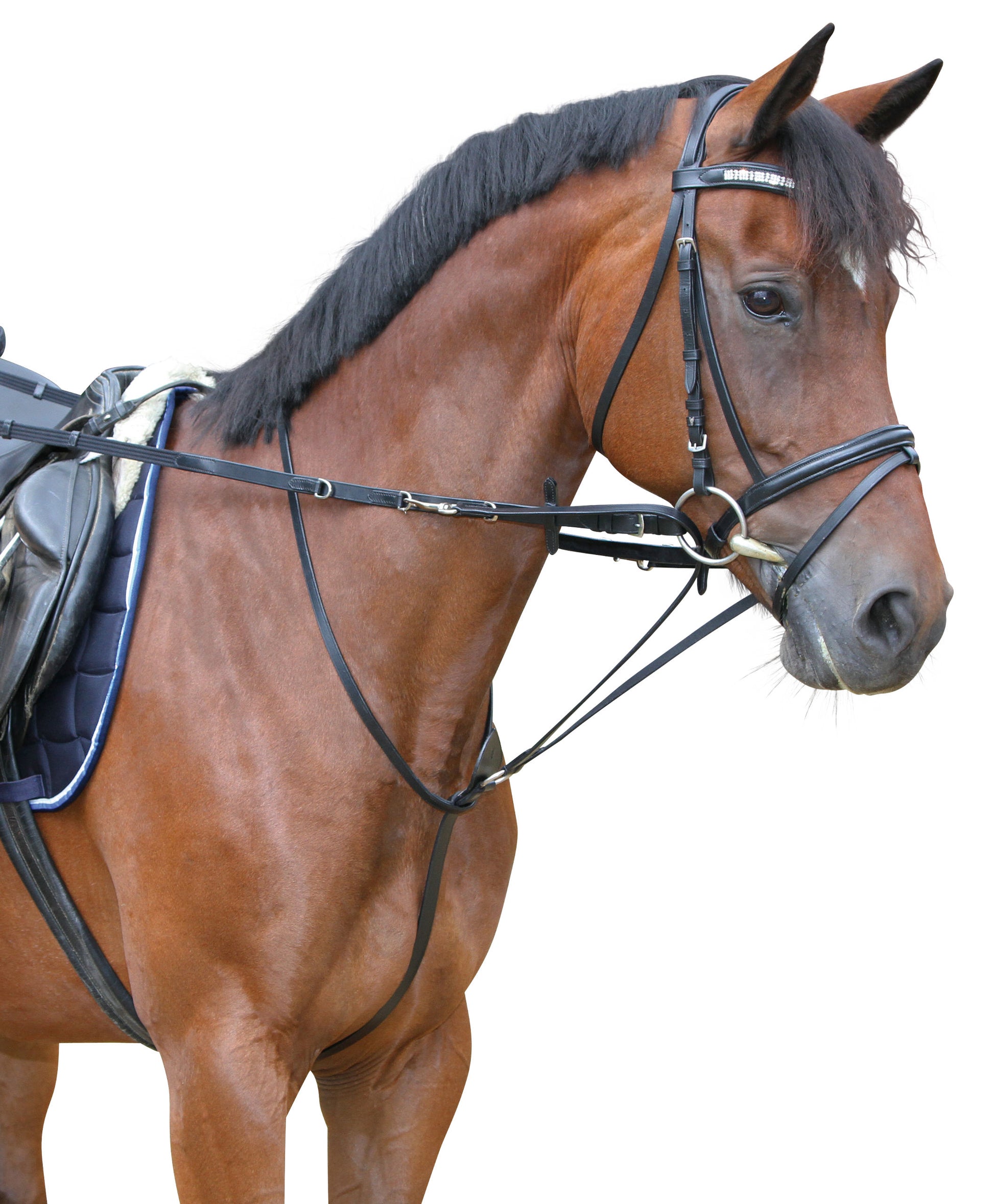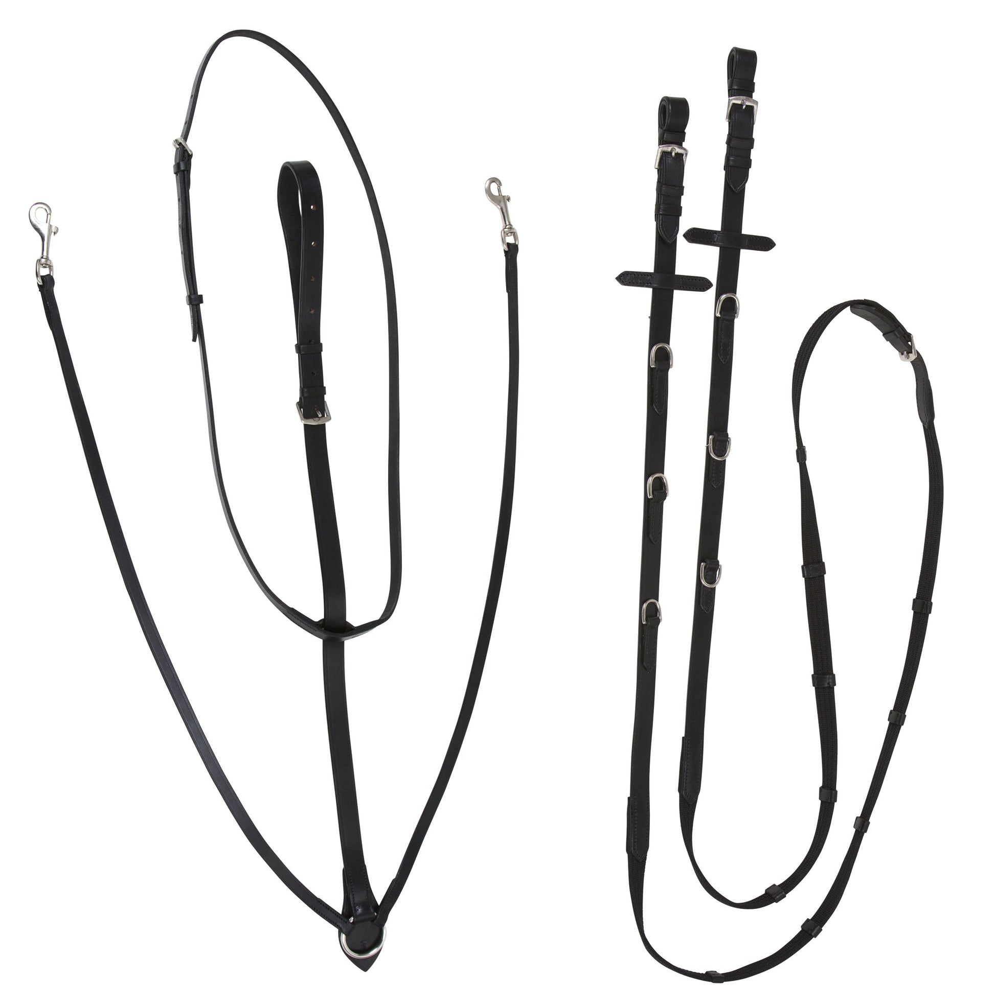 • combinaison classique des rênes et de la martingale • également connu sous le nom d‘enrênement Köhler • Martingale avec mousqueton à accrocher dans les maillons D • Rênes avec arrêtoir en cuir et 3 maillons D • Matière: Cuir